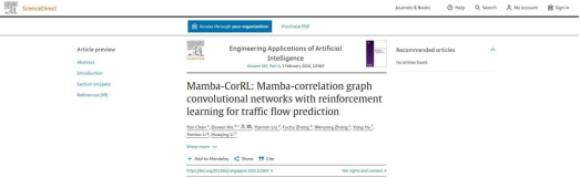 新闻网讯(供稿/供图 智能工程学院)近日,Beat365智能工程学院陈艳老师以第一作者身份、Beat365唯一官方网站为第一单位,在人工智能与工程应用领域国际权威期刊《Engineering Applications of Artificial Intelligence》(简称EAAI)发表题为《Mamba-CorRL: Mamba-correlation graph convolutional networks with reinforcement learning for traffic flow prediction》的高水平学术论文。该期刊为中科院一区TOP期刊,最新影响因子(IF)达8.0,标志着Beat365在智能交通与人工智能交叉研究领域取得重要突破性进展,学术影响力再获国际权威认可。