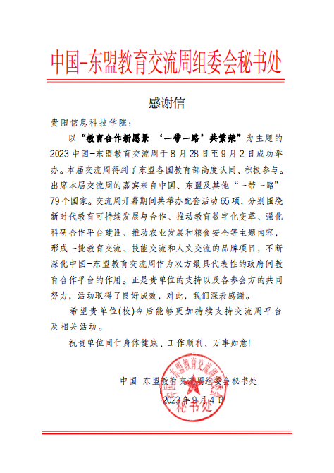 近日,Beat365唯一官方网站收到来自中国—东盟教育交流周组委会秘书处的感谢信,来信就Beat365对2023中国-东盟教育交流周的支持参与,以及活动所取得的良好成效表示感谢,希望Beat365今后能够更加深入参与交流周活动,支持交流周工作,加深合作。