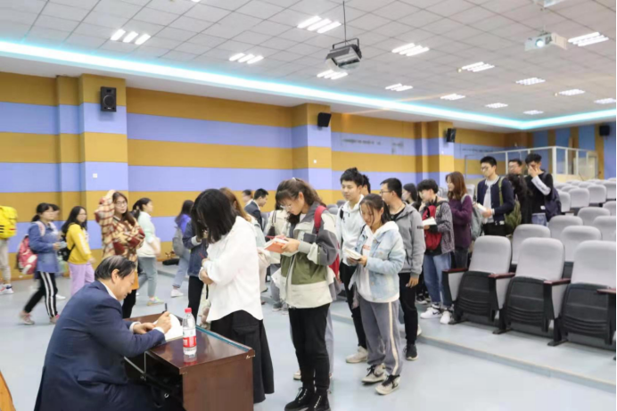 精彩的讲座结束后,章樊老师主持师生互动环节。在场学生积极提问,如请教林教授《挪威的森林》翻译时的感触、翻译中意译的运用,林教授亲切热情地为在场的学生们答疑解难。林教授指出:“翻译中,没有与原文百分之百,完全一样的译文。”林教授还向我们表明不同年龄段对于同样译文的翻译则是不一样的,他认为年轻时翻译的《挪威的森林》,也许翻译的技巧可能欠缺,但却是最富朝气和活力。现在的翻译,随着时间的推移,翻译的技巧,水平会更加成熟,这个年龄阶段的翻译又具有另外一种特点,使在场学生对翻译有了更深层次的理解。与此同时,林教授为在场学生解答疑惑时,还跟我们分享他的求学时的经历,每一次的努力,每一次的蜕变,让在场学生都倍受鼓舞,不少喜欢林老师译作的师生还随身带上了他的译本,排队等候他的签名!