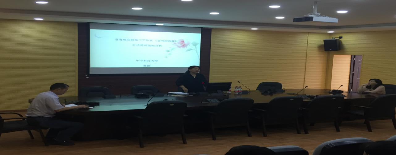 【通讯员王余辉】 5月29日上午,华中科技大学新葡萄8883官网amg博士生导师,英语系主任,翻译研究中心主任黄勤教授,于新葡萄8883官网amg文科楼117口译教室为新葡萄8883官网amg师生带来了一场名为:“语境顺应视角下王际真《老明的故事》对话英译策略分析”的讲座。