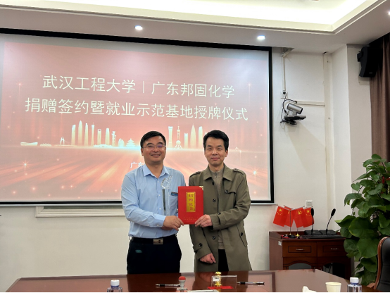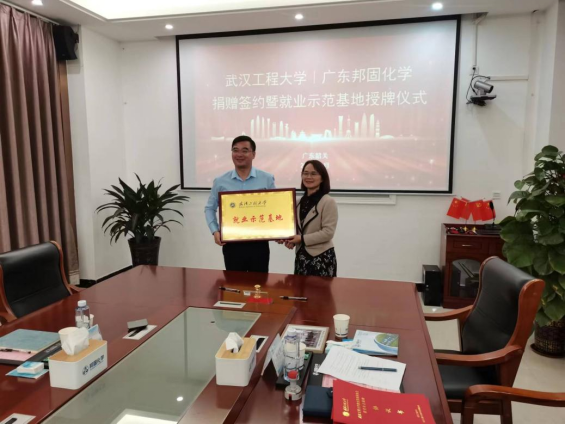 仪式上,王火利为邦固化学颁发了捐赠证书和纪念杯,陈明芳授予了就业示范基地牌匾,毕灵敏与企业主要负责人共同签订了捐赠协议。
