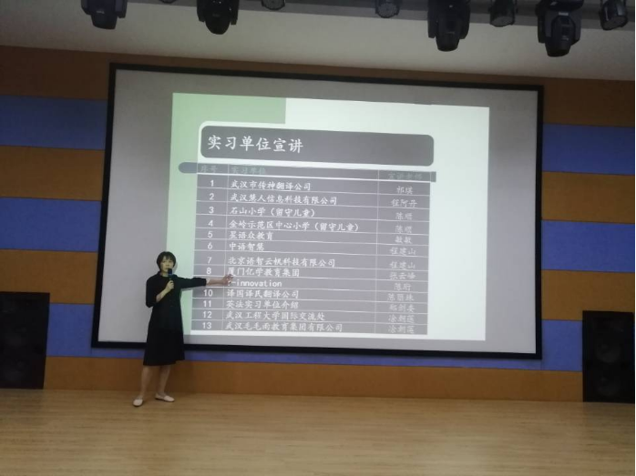 本次实习动员会邀请了阿里国际站、武汉市传神翻译公司、武汉慧人信息科技有限公司、武汉市星语众教育、厦门亿学教育集团、武汉毛毛雨教育集团有限公司、译国译民翻译公司、上海啄言翻译咨询有限公司14家单位依次为学生分别就公司情况,实习项目和就业机会进行了宣讲,各实习单位表示欢迎外院学生前往实习。同学们可以根据自己的意愿与实习单位双向选择。