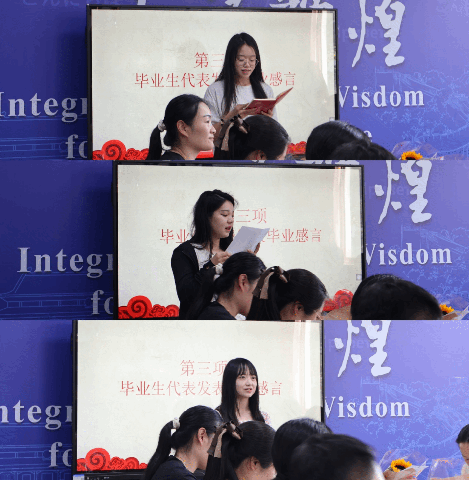 在毕业感言环节,本科毕业生党员代表英语专业胡云云回顾了从初入校园的懵懂到党旗下庄严宣誓的成长历程,分享了志愿服务中的收获,深切表达了对师长教诲与党组织培养的感恩之情,以及勇毅前行的坚定信念。本科毕业生代表汉教专业肖欣细数大学四年专业学习的蜕变,感谢学院提供的坚实后盾,让其能够大胆尝试、追逐梦想。硕士毕业生代表易紫璐畅谈研究生阶段科研探索的感悟,表达了将在奔赴的工作岗位上继续弘扬外语学子的使命担当。三位代表的发言情真意切,引发了在场师生的强烈共鸣。