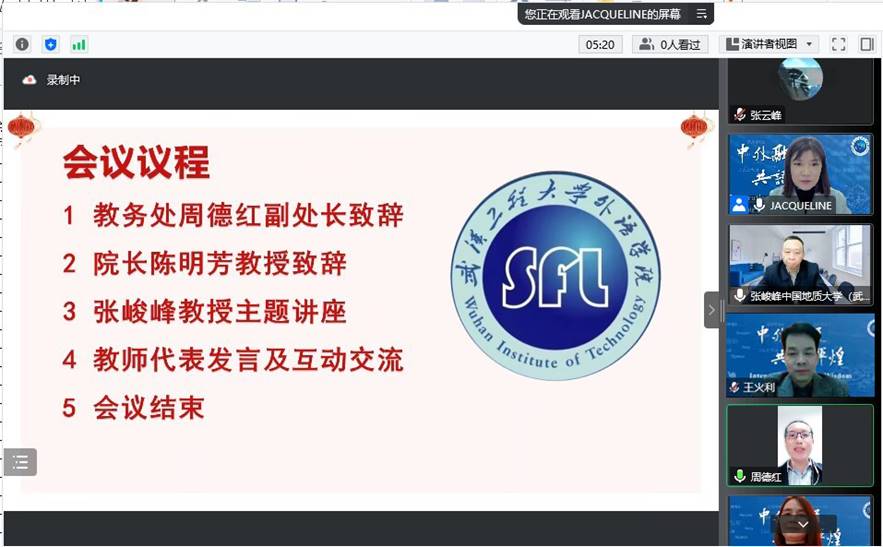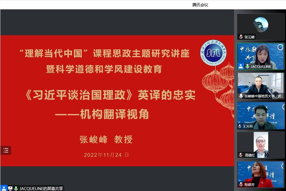 (通讯员:别尽秋、余果)为庆祝新葡萄8883官网amg建校五十周年,新葡萄8883官网amg与校庆办、教务处、研究生院联合举办高端学术讲座。本次讲座于2022年11月24日下午在线上举行。主讲嘉宾为中国地质大学(武汉)外国语学院院长、博士生导师张峻峰教授,讲座题目为“《习近平谈治国理政》英译的忠实——机构翻译视角”。会议由新葡萄8883官网amg副院长别尽秋主持,教务处副处长周德红,新葡萄8883官网amg领导班子全体成员、学院教师及研究生共计160余人参加了本次讲座。本次讲座为新葡萄8883官网amg教研工作坊“理解当代中国”课程思政主题研究讲座暨研究生科学道德和学风建设教育系列活动。