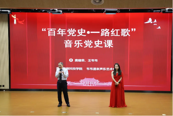 课中,王韦韦通过《映山红》《唱支山歌给党听》《春天的故事》等经典红歌,生动阐释歌曲背后的党史故事和时代精神。全体师生在旋律中重温党的光辉历程,现场互动合唱将气氛推向高潮。