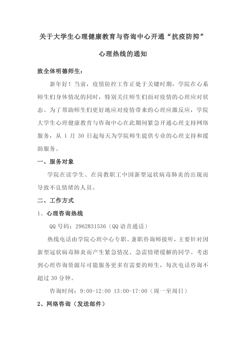 关于大学生心理健康教育与咨询中心开通“抗疫防抑”心理热线的通知