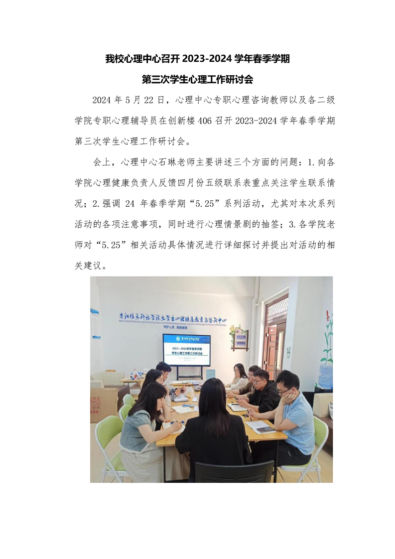大学生心理健康教育与咨询中心组织心理辅导员召开2023-2024学年第二学期第3次学生心理工作安全会议