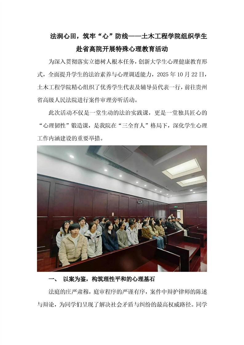 法润心田,筑牢“心”防线——土木工程学院组织学生赴省高院开展特殊心理教育活动