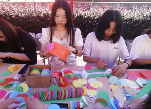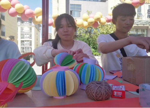 在制作灯笼环节,通过观看制作视频及现场展示的步骤,参与人员用剪刀、彩纸、双面胶等工具进行制作。首先多准备一些彩色的圆形纸张,将纸张折叠,并将折好的彩纸粘贴在一起;其次将所有的圆形彩纸都按照同样的方式粘贴起;接着用黄色彩纸剪出流苏,并用线将流苏串联起来;最后,将线放在彩纸中间,将彩纸展开并粘贴住,简单好看的灯笼就做好啦!为了丰富活动,制作灯笼不仅能得到小礼品一份还能参与抽奖,这大大激起了同学们的参与力,纷纷热情加入其中。