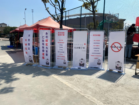 预防诈骗、结核病知识宣传活动。身穿蓝色马甲的土木工程系志愿者们,提前摆好了反诈骗宣传点位,挂好横幅和易拉宝。中午12时整,我系志愿者们以饱满的精神状态为全校师生宣贯反诈骗知识,并耐心讲解结核病的相关注意事项,提示大家做好春季传染疾病的预防,同时通过"零距离"的反诈宣传,提升同学们的识骗防骗能力,进一步筑牢同学们的安全防线,营造和谐稳定的校园环境。