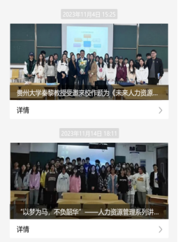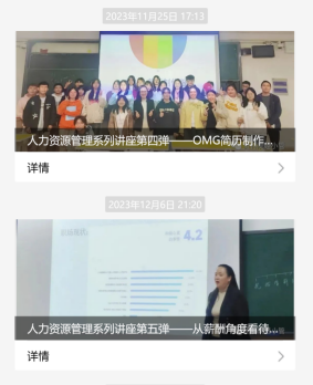三是人资社团。为提升学生的学习兴趣、合理统筹安排学生的比赛及业余生活,由教研室教师指导参与、人力资源管理专业学生为中坚力量成立了人资社团。该社团希望同学们能够摆脱单独枯燥地学习理论知识的方式,在课余时间更多将专业知识用于实践当中,人资社团将会为同学们提供更多参与专业实践的机会。人资社团自2022年开创以来,陆续开办了人力资源相关讲座6场以上,累计参与学生1000人以上,主讲人均为行业或教学相关专家,参加讲座的同学均表示通过讲座对行业和职业认知更加清晰,受益匪浅。