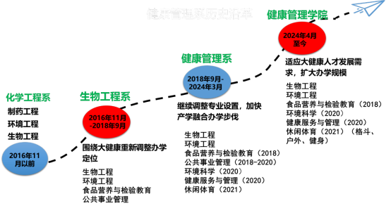 健康管理学院前身为化学工程系、生物工程系,历经专业调整与办学定位优化,自2016年11月起逐步转型为多学科交叉、产学研一体化的教育平台。其发展可追溯至更早的生物工程、环境工程、制药工程学科基础,2018年9月起进一步拓展专业布局,陆续引入食品营养与检验教育、环境科学、健康服务与管理及休闲体育等专业,最终形成以“大健康”为核心的专业群,致力于为新时代大健康产业输送高素质应用型人才。