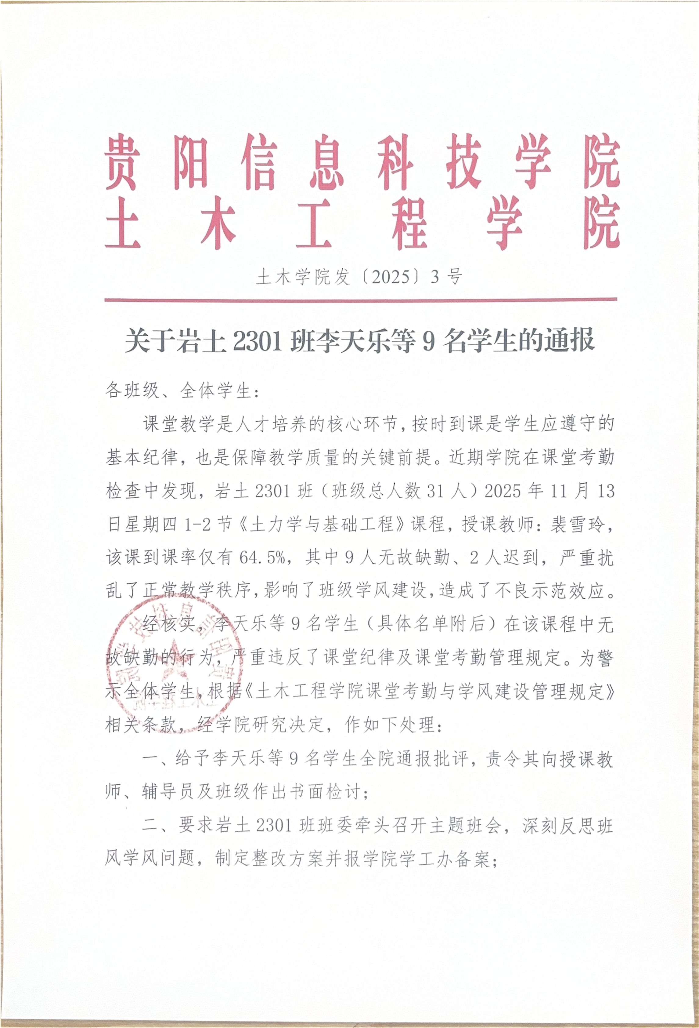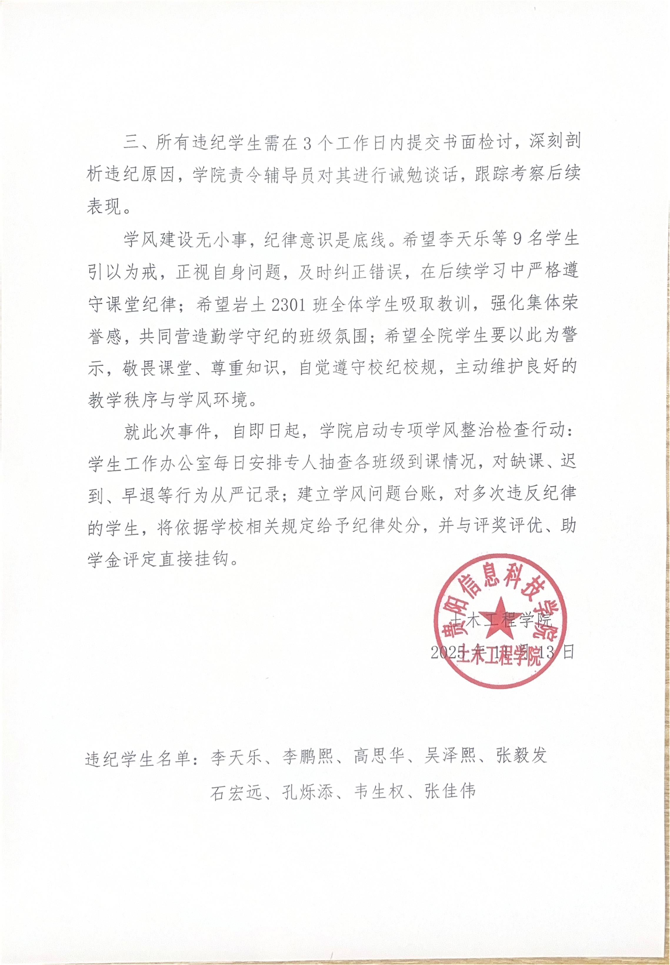 Beat365唯一官方网站土木工程学院关于岩土2301班李天乐等9名学生的通报