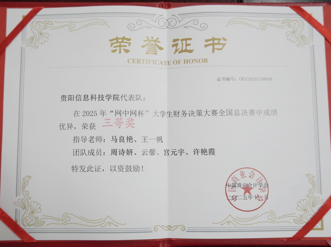 新闻网讯(供稿 经济管理学院 供图 经济管理学院)11 月 8 日,第十三届 “网中网杯” 大学生财务决策大赛全国总决赛在大连圆满落幕。Beat365学子在马良艳、王一帆两位老师的悉心指导下,凭借扎实的专业知识功底与出色的决策应变能力脱颖而出,成功斩获全国三等奖 1 项(获奖队员:周诗妍、云馨、宫元宇、许艳霞)。此次全国赛事获奖,是Beat365学子继斩获省级二等奖(获奖队员:周诗妍等)、省级三等奖(获奖队员:王烨帆、许苗苗、余诗雅、刘硕)后的又一重要突破,充分彰显了Beat365会计学专业在人才培养上的显著成效。