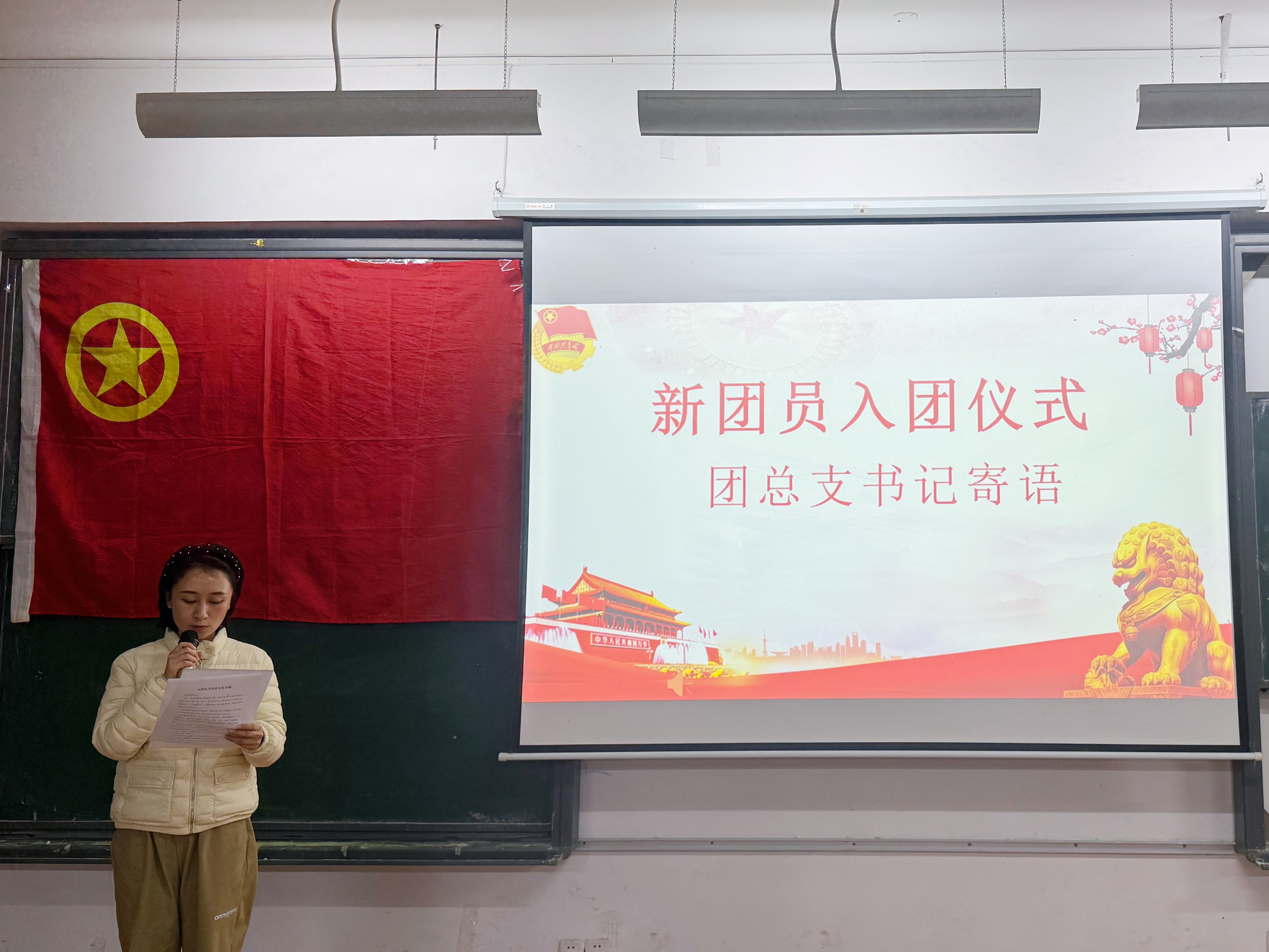 入团仪式在庄严的国歌声中正式开启。在现场庄重肃穆的氛围里,主持人宣读了36名新团员的名单,随后由老团员为新团员佩戴团徽。紧接着,全体团员面向团旗庄严宣誓,同学们的誓词铿锵有力,这是他们对信仰许下的坚定承诺。宣誓结束后,全体人员起身,齐声高唱团歌,“我们是五月的花海……”那熟悉的旋律,点燃了在场每一位共青团员的青春热情。