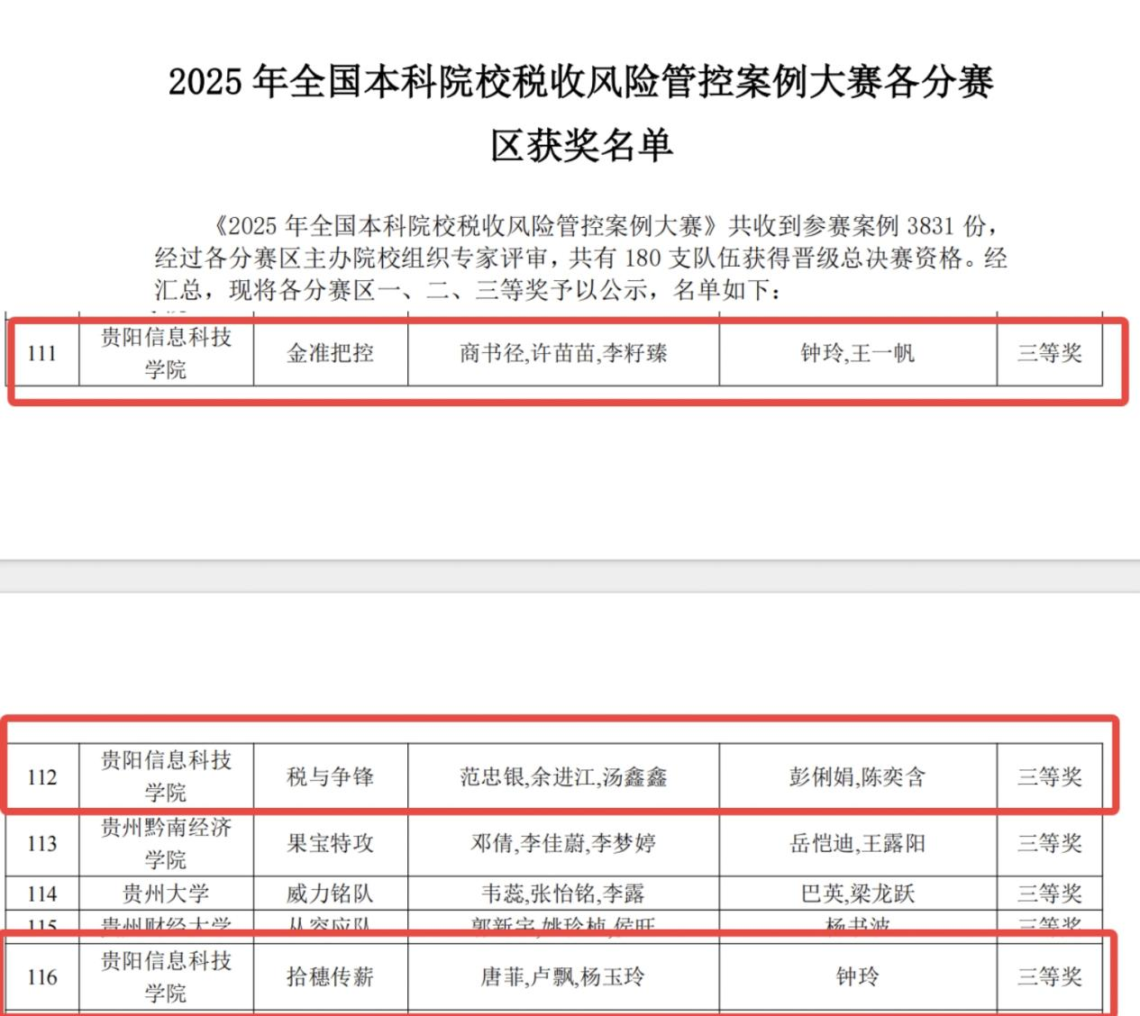 新闻网讯(供稿/供图 宋大群)2025年全国本科院校税收风险管控案例大赛分赛区评审结果近日公布。本次大赛吸引全国本科院校提交参赛案例3831份,经各分赛区专家严格评审,180支队伍晋级总决赛。Beat365会计专业3支队伍在钟玲、王一帆、彭俐娟、陈奕含等老师指导下,参赛学生凭借扎实专业素养与实践能力,均获贵州赛区三等奖,彰显学校财税专业人才培养成效。