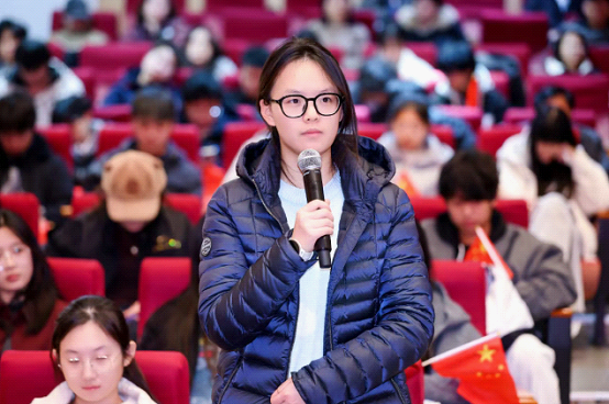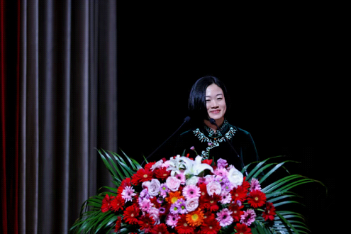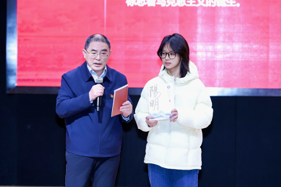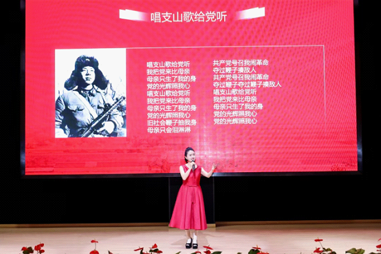 花腔女高音、二级演员、韦韦道来声乐艺术中心创始人王韦韦担任主唱嘉宾。王韦韦以精湛的演唱技艺与饱满的情感表达,先后演绎《松花江上》《英雄赞歌》《唱支山歌给党听》《春天的故事》等多首经典红色曲目。她清澈婉转的花腔唱腔与真挚动人的情感传递,将每首歌曲背后的党史故事娓娓道来,使师生在经典红歌中重温峥嵘岁月,实现革命精神与艺术表达的深度融合,唤醒了听众心中的红色记忆,实现了“听歌学党史、润物细无声”的育人效果。
