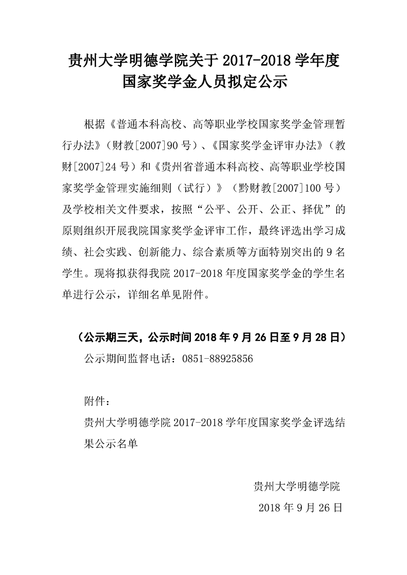 贵州大学明德学院关于2017-2018学年度国家奖学金人员拟定公示