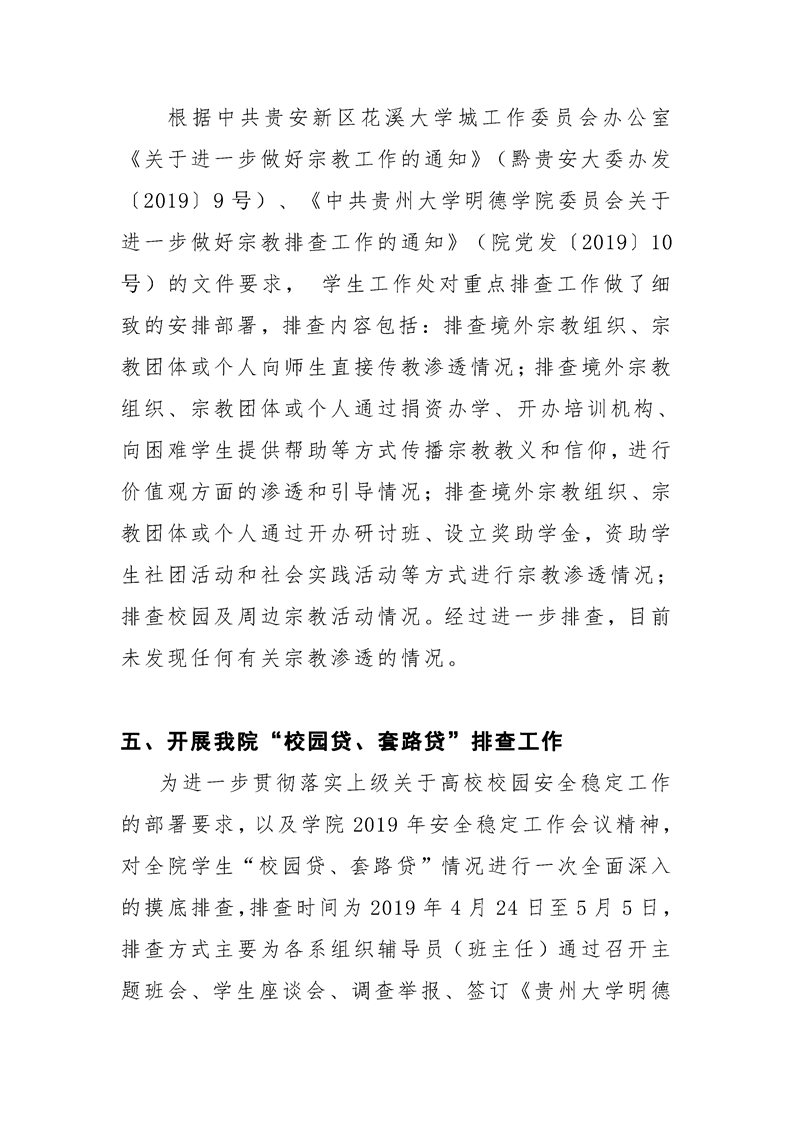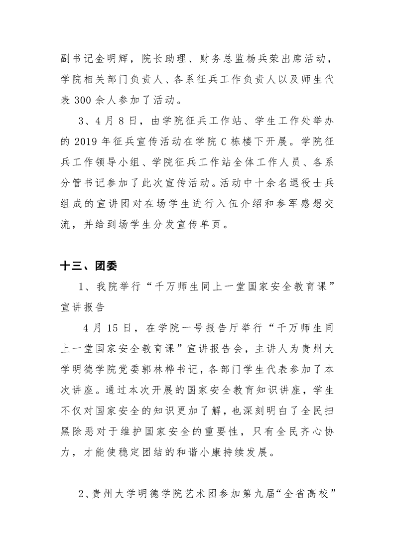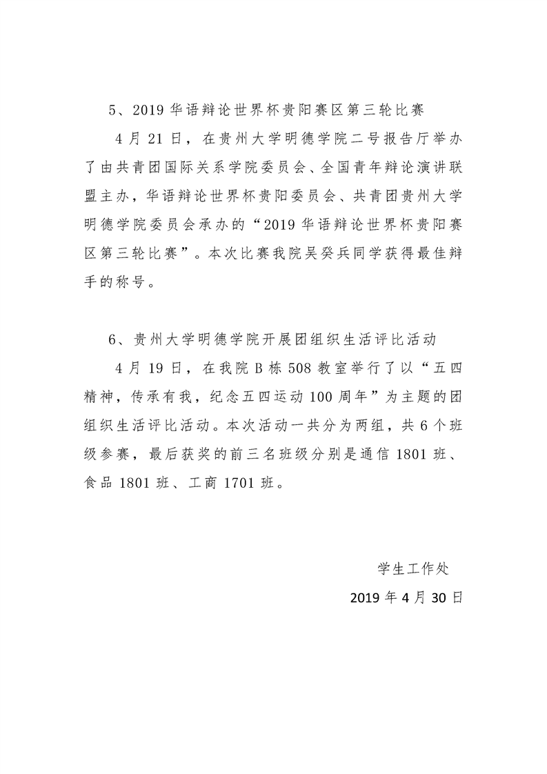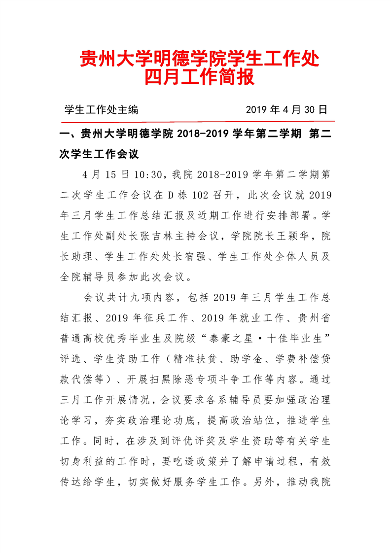 贵州大学明德学院学生工作处2019年4月工作简报