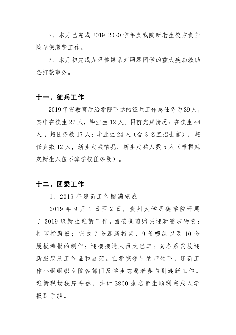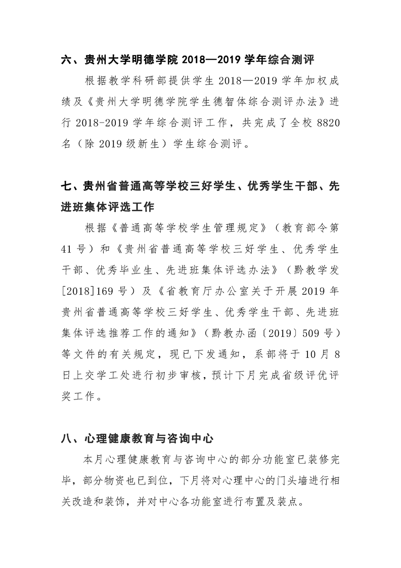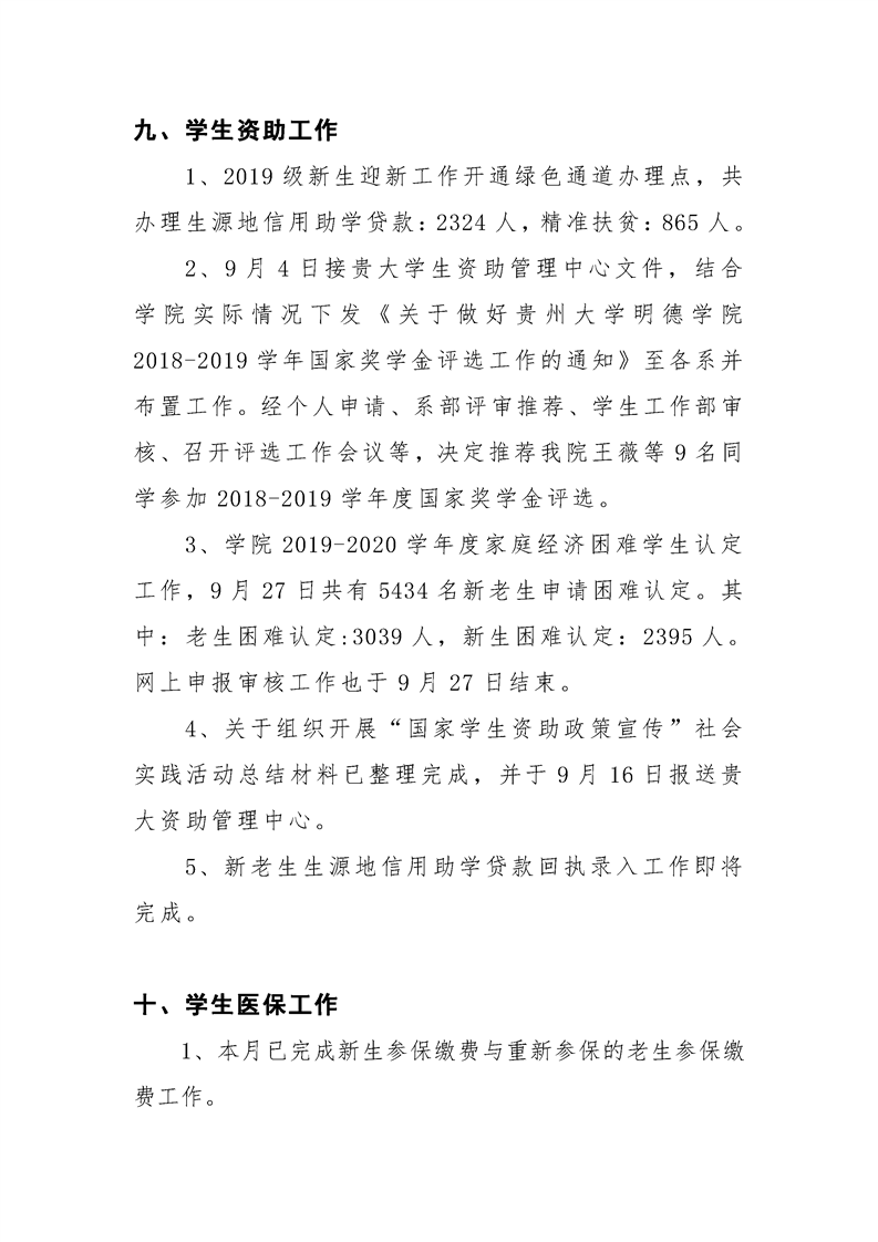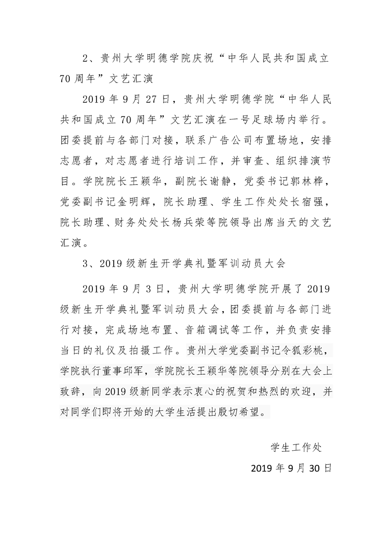 贵州大学明德学院学生工作处2019年9月工作简报