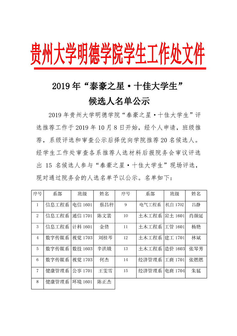 2019年“泰豪之星·十佳大学生”候选人名单公示