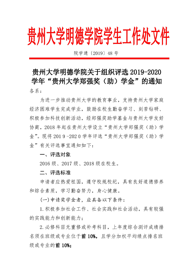 贵州大学明德学院关于组织评选2019-2020学年 “贵州大学郑强奖(助)学金”的通知