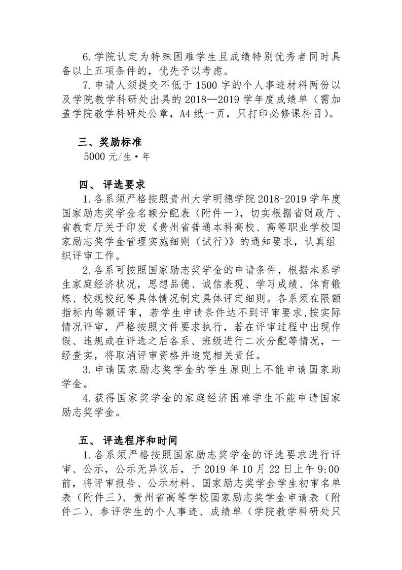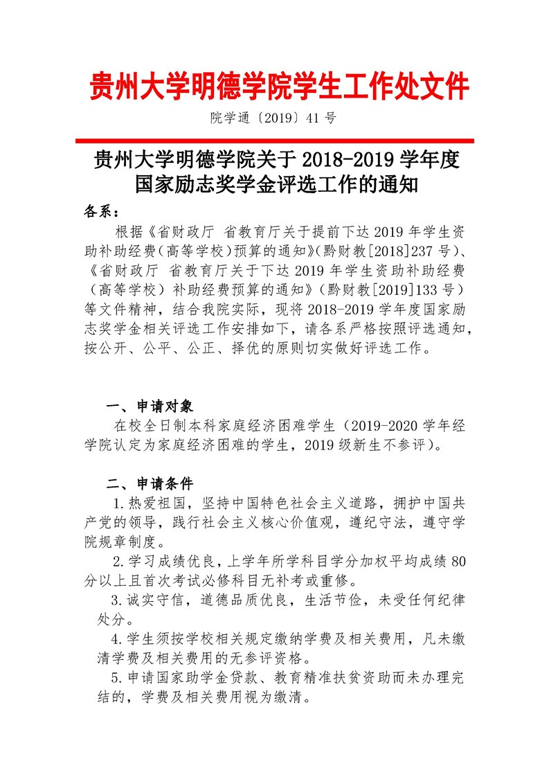 贵州大学明德学院关于2018-2019学年度国家励志奖学金评选工作的通知