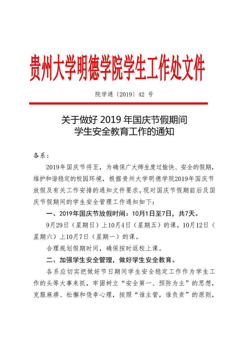 关于做好2019年国庆节假期间学生安全教育工作的通知
