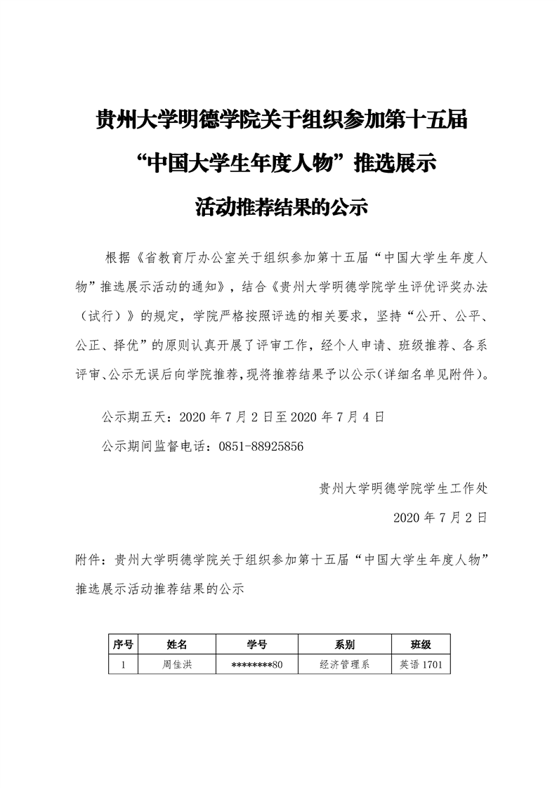 贵州大学明德学院关于组织参加第十五届“中国大学生年度人物”推选展示活动推荐结果的公示