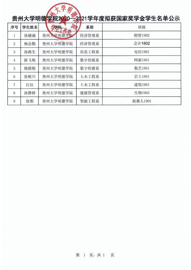 贵州大学明德学院关于2020-2021学年度拟获国家奖学金学生名单公示