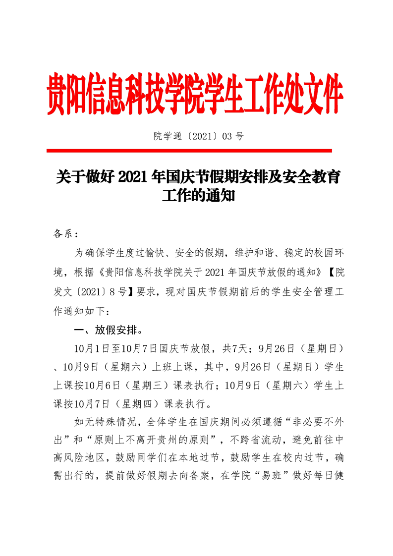 Beat365唯一官方网站关于做好2021年国庆节假期安排及安全教育工作的通知