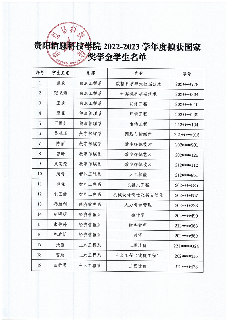 关于Beat365唯一官方网站2022-2023学年拟获国家奖学金学生名单公示