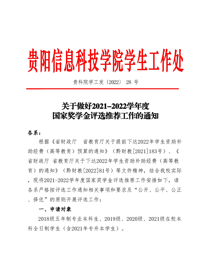 关于做好2021-2022学年度国家奖学金评选推荐工作的通知