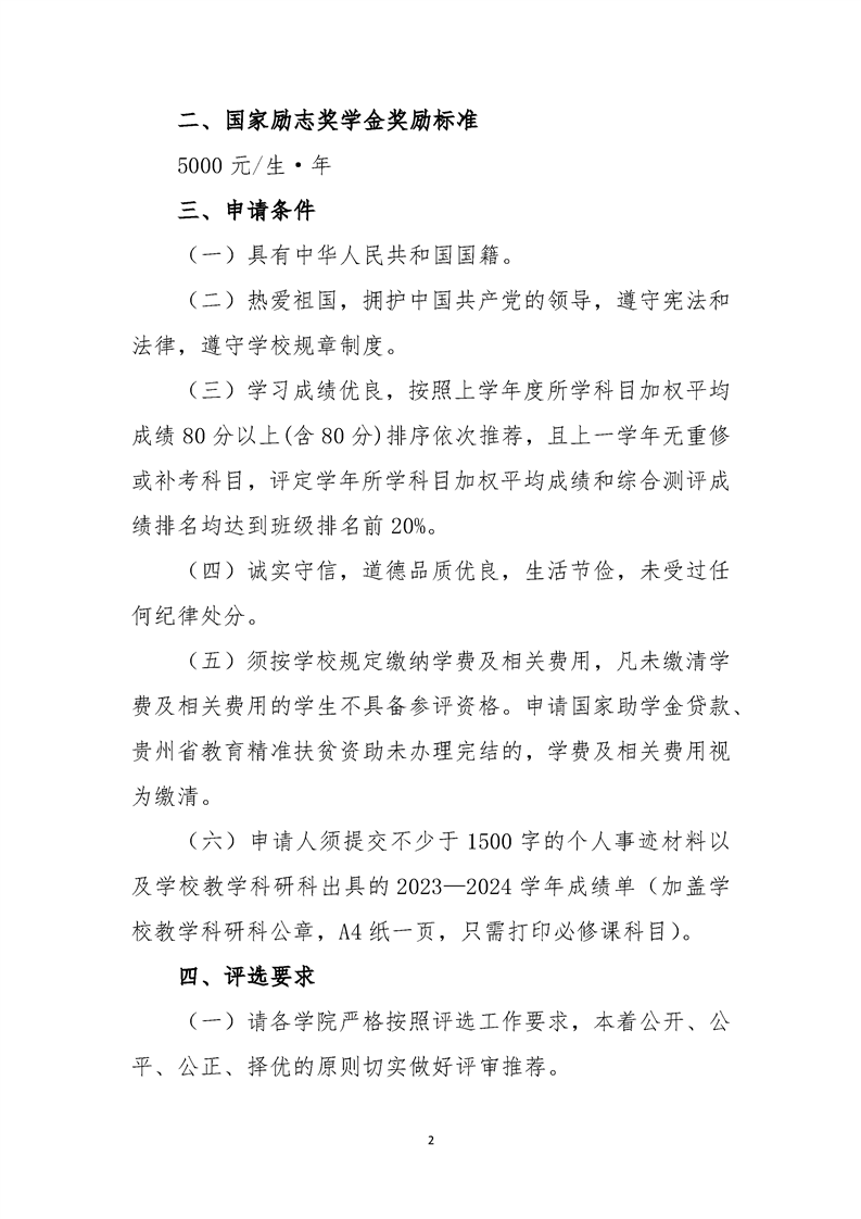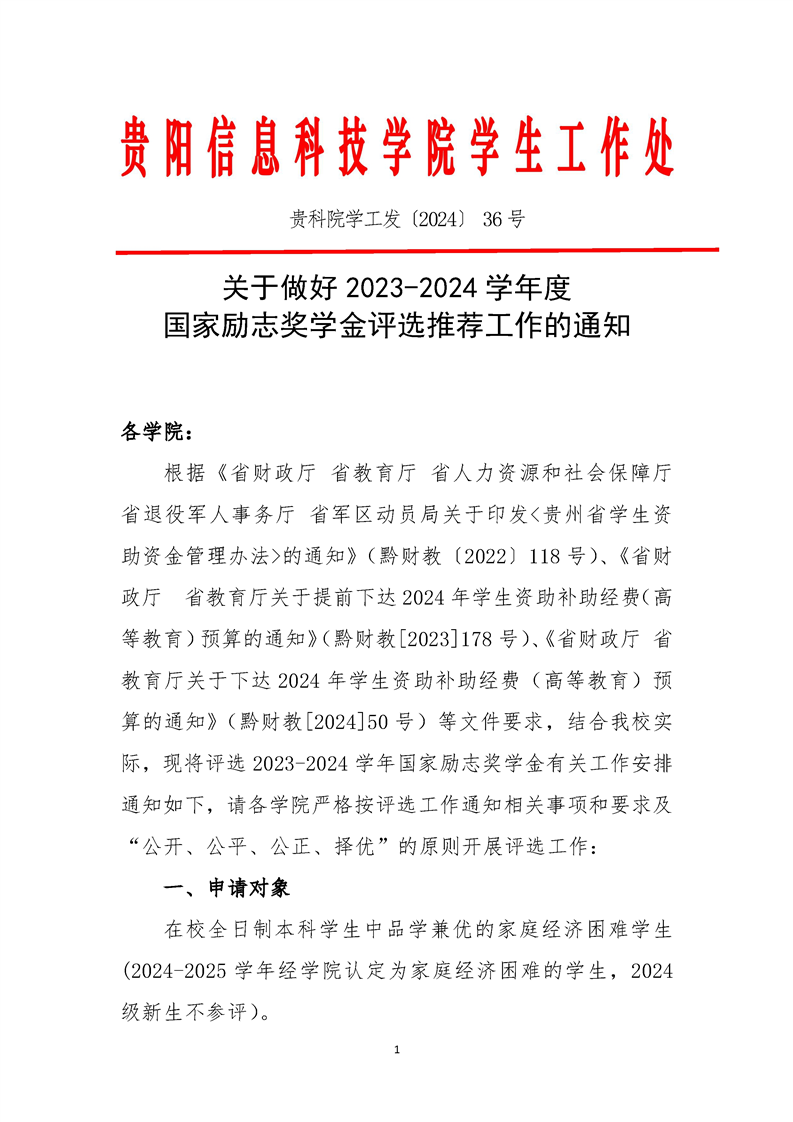 贵科院学工发〔2024〕36号 关于做好2023-2024学年度国家励志奖学金评选推荐工作的通知
