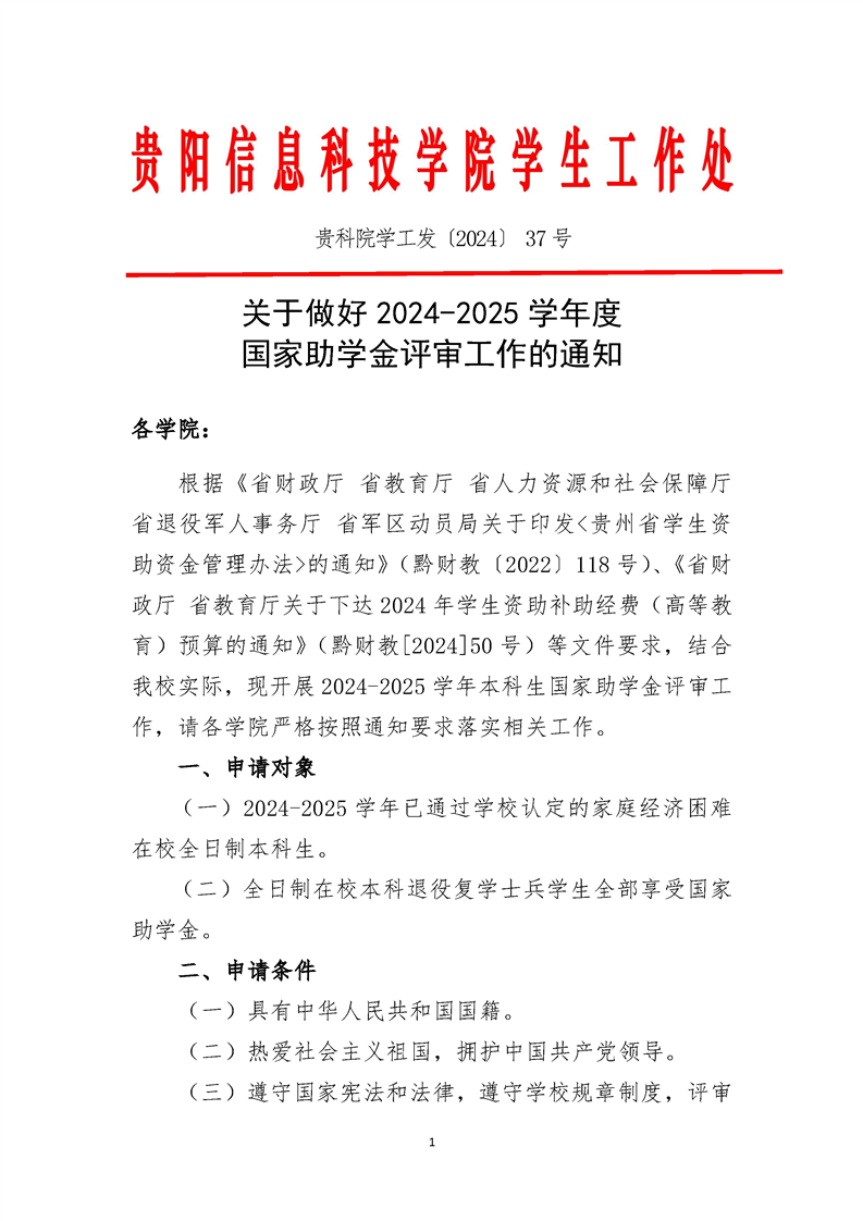 【贵科院学工发〔2024〕37号】关于做好2024-2025学年国家助学金评审工作的通知