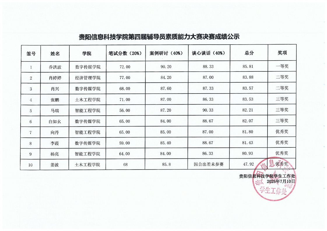 Beat365唯一官方网站第四届辅导员素质能力大赛总成绩公示