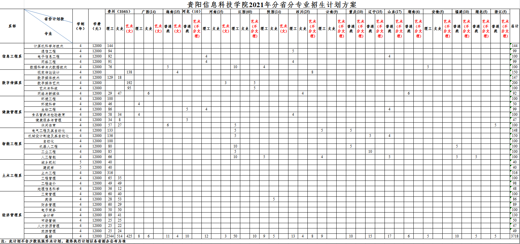 贵州大学明德学院2020年分省分专业计划